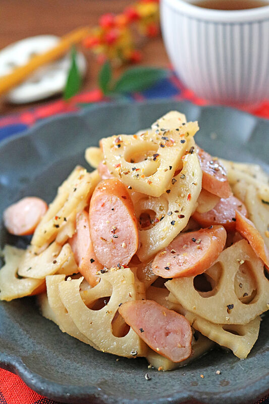 ソーセージを薄切りにしてレンコンの上に乗せる。