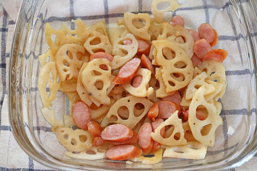 レンコンのソーセージを重ねてレンジで加熱しているので
