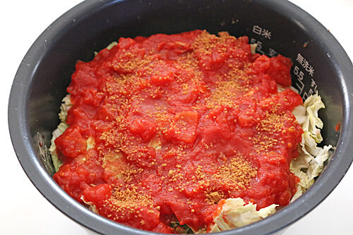 3、2の上に白菜の葉を乗せ、※を加える。