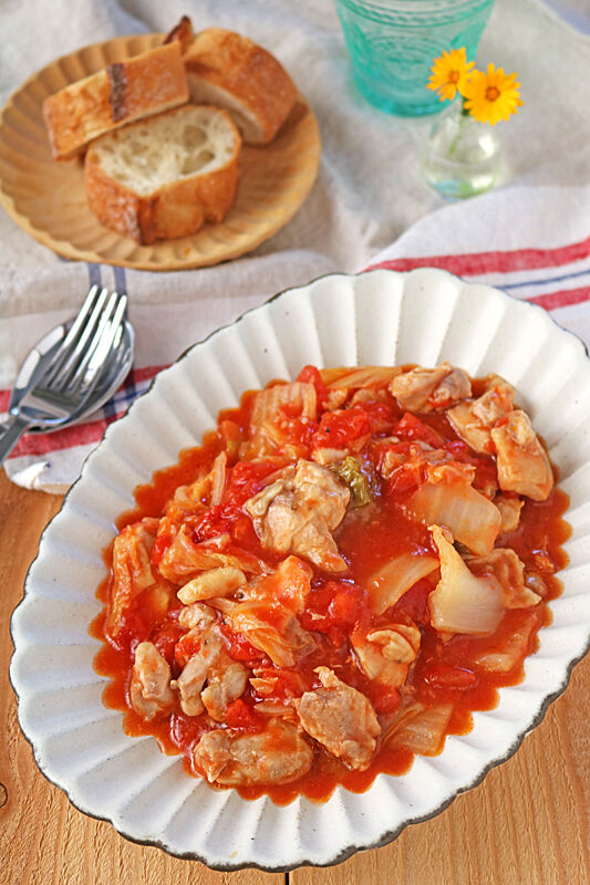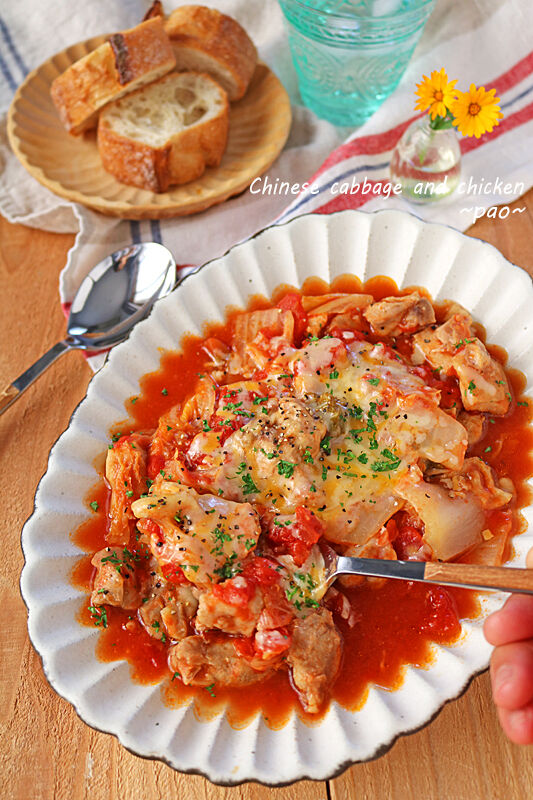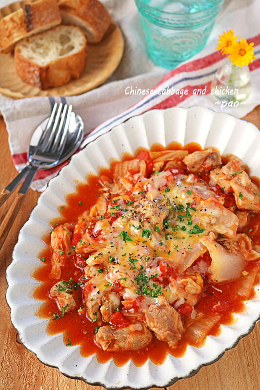 白菜と鶏肉のとろとろトマトチーズ煮です。