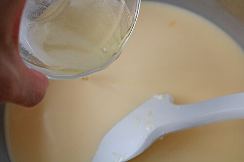 4、小鍋で砂糖を加えて40度くらいに温めた牛乳と生クリームを