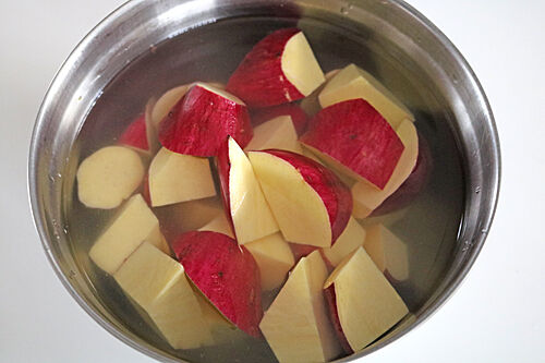 1、さつまいもは乱切りにし、水にさらしてアクを抜く。