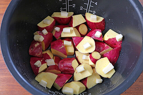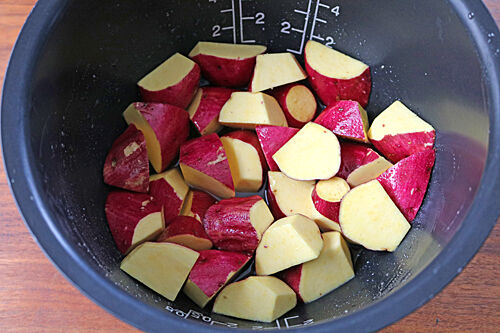 さつまいもを切って、タレと一緒に