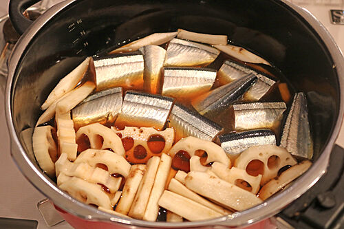 さんまと根菜を加えて、生姜の千切りを散らす。