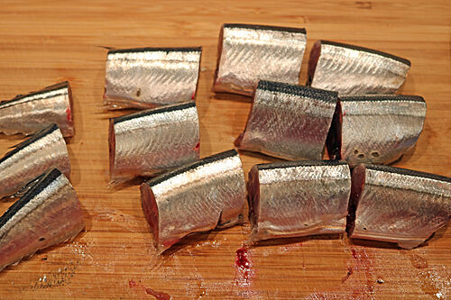 2、さんまは頭を取り除き、4等分に切り、内臓を取り除き