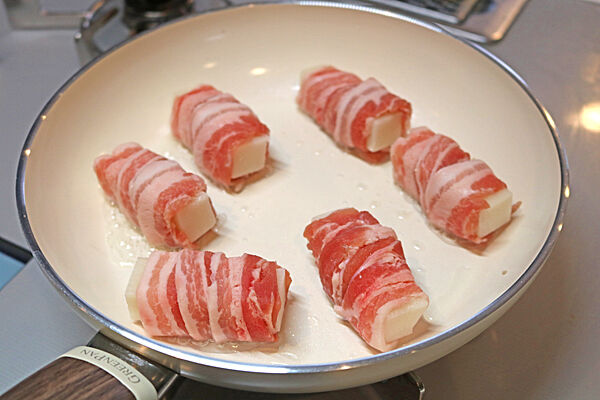 2、フライパンにサラダ油を熱し、巻き終わり部分を下に向けて