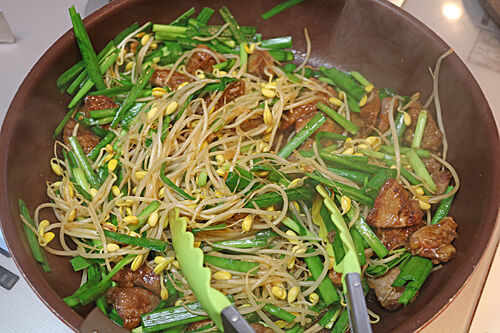 5,両面色が変わったら、豆もやしを加えて蓋をして2分くらい