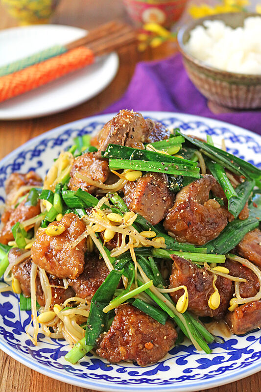 6,◎を加えて煮絡め、4cm長さに切ったニラを加えて