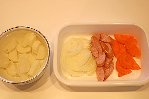 人参は薄いイチョウ切り、ソーセージは斜め切りにする。