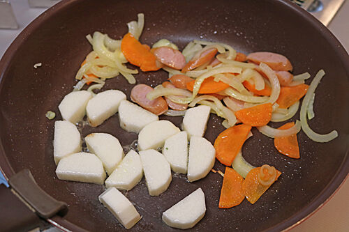 3,フライパンにサラダ油を熱し、玉ねぎ、人参、ソーセージを炒める。