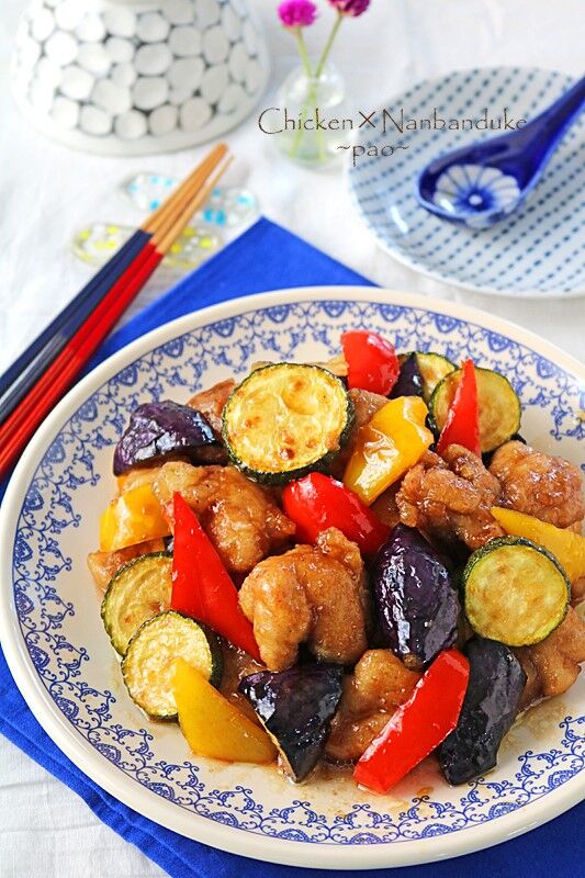夏の作り置きやお弁当に!少ない油で夏野菜と鶏肉の南蛮漬け♪
