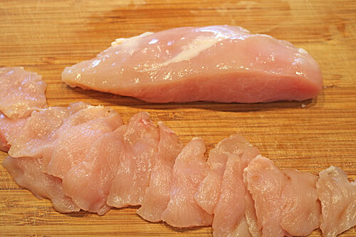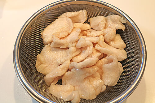 そぎぎりした鶏むね肉を片栗粉でコーティングをし、
