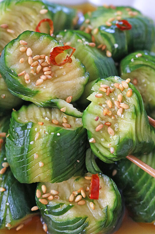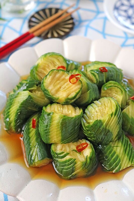1,きゅうりは裏表に1本ずつピーラーで皮をむく。