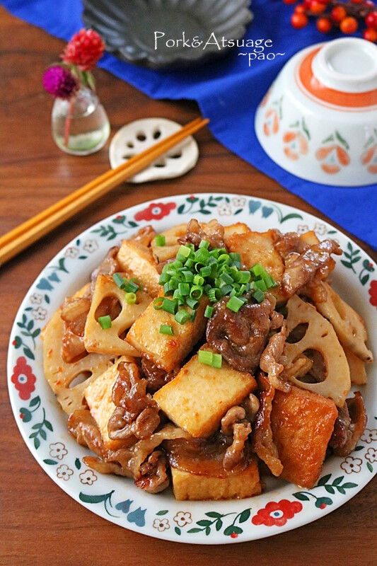 豚小間と厚揚げレンコンの甘辛味噌照り焼きです。