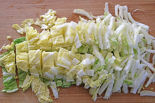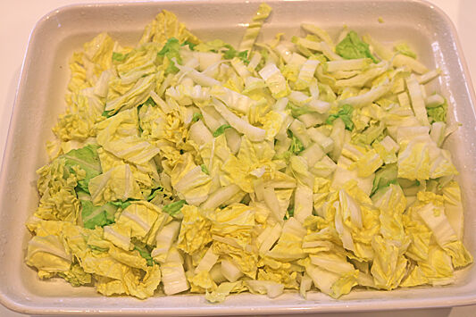 1.白菜は4cmの長さに切り、芯の部分は5mm幅、葉の部分の1~2cm幅に切る。