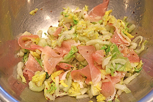 白菜、生ハムに3のマリネ液を加え、よく和えて完成!!
