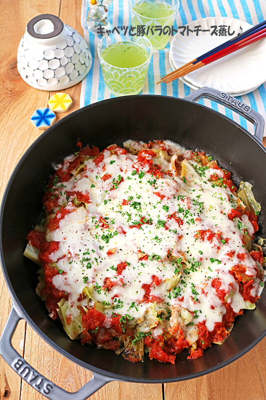 材料重ねてほったからしで簡単!豚バラとキャベツのトマトチーズ蒸し