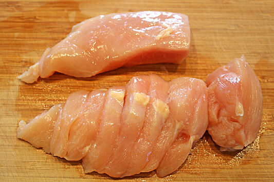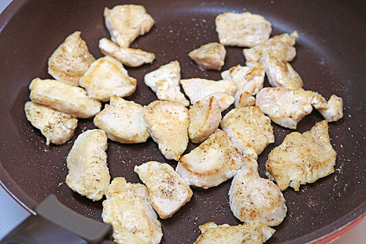 4.フライパンに残りのサラダ油を熱し、2の鶏むね肉を焼く。