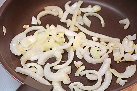 3.フライパンにサラダ油大さじ1/2を熱し、新玉ねぎを炒める。