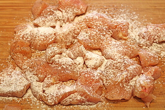 2.塩こしょうをふり、片栗粉をふるいかけて薄くまぶす。