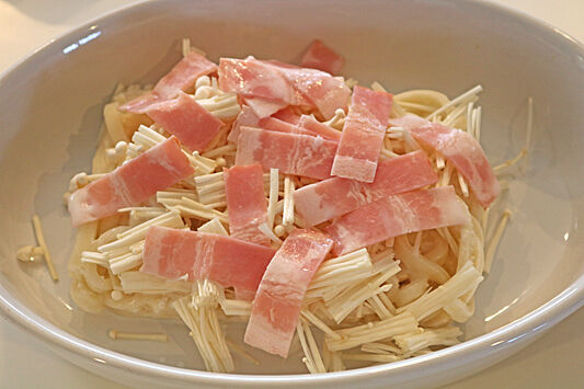 えのき、ベーコンの順に重ね、ラップをして600wの電子レンジで