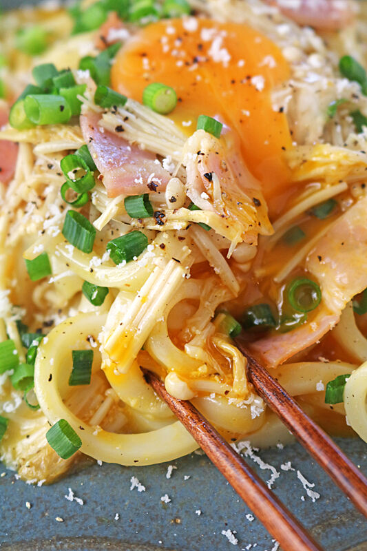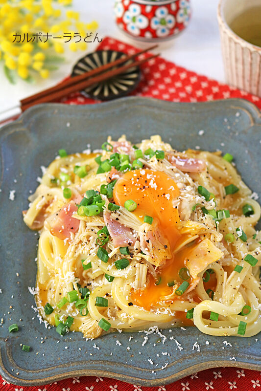 レンジで5分♪冷凍うどんで簡単和風カルボナーラ風うどん