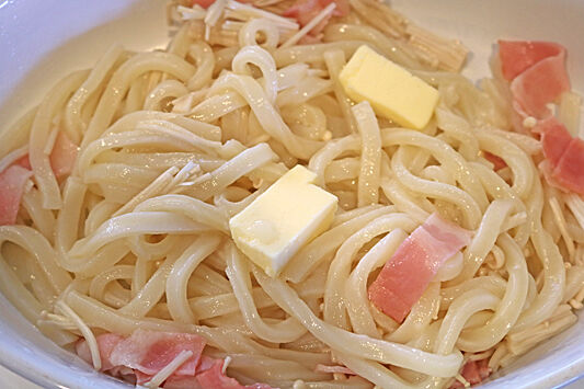 2.うどんを混ぜ合わせ、バターを加えて、