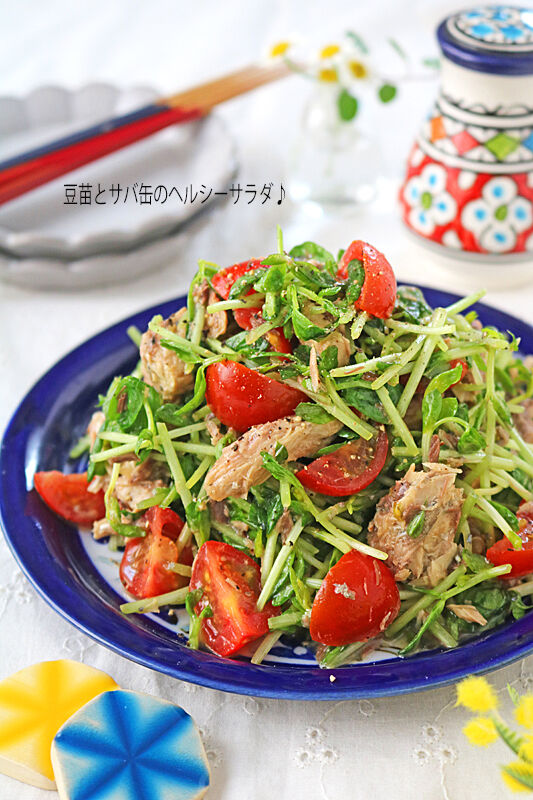 シャキシャキ感が美味しい豆苗とサバ缶のサラダです~♪