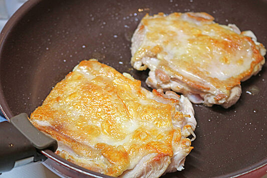 中火で熱したフライパンに、鶏もも肉の皮面を下にむけて