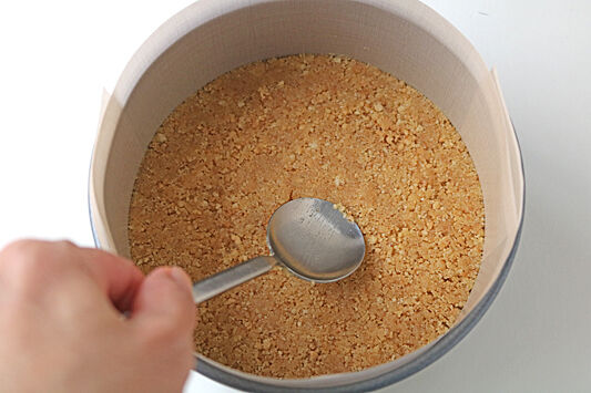 無塩バターを電子レンジで溶かして、グラハムビスケットに加えて混ぜ合わせる。