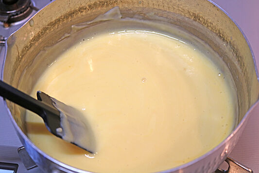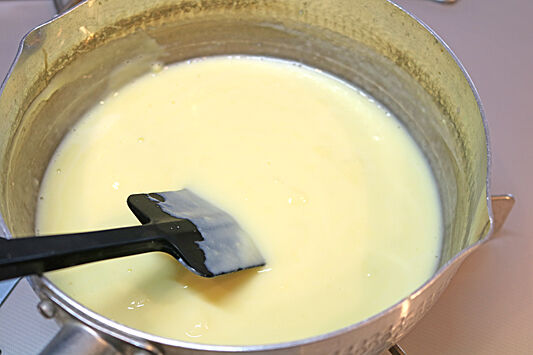 砂糖と残りの牛乳を少しずつ加えて弱火で加熱しながらのばす。