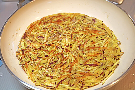 3.熱したフライパンにバターの半量を溶かし、2のさつまいもを平らに広げる。
