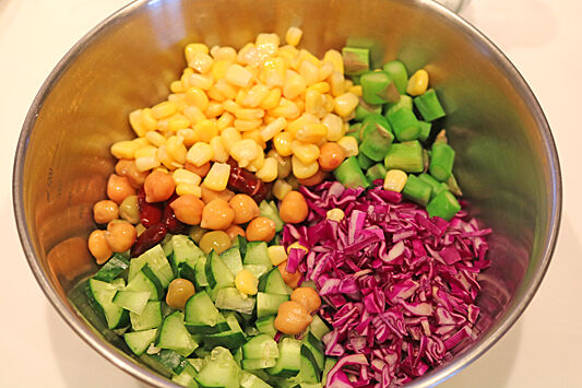 サラダは紫キャベツ、きゅうり、セロリ、アスパラ、コーン、