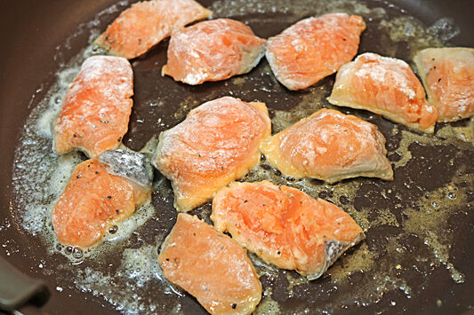 5.鮭が白っぽくなってきたら、半分に寄せて裏返し、