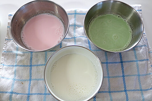 今回はお手軽に、ベースのミルクぷりん生地を3つに分けて・・