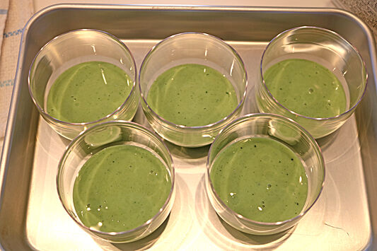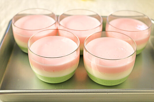 抹茶味同様に底に氷水をあてて冷やし、少しとろみがついたら流し入れて重ねていく。