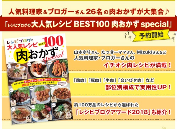 レシピブログの大人気レシピBEST100肉おかずspecial!! 2019年01月14日 こんばんは。今日は掲載本の紹介をさせてくださいね。レシピブログの大人気BEST100肉おかずspecialの予約が開始されました~!!人気料理家さん&人気ブロガーさん26名のランキング上位レシピ110点収録したお料理本です。肉おかずって魅力的~♪ついついワンパターン ... 続きを読む